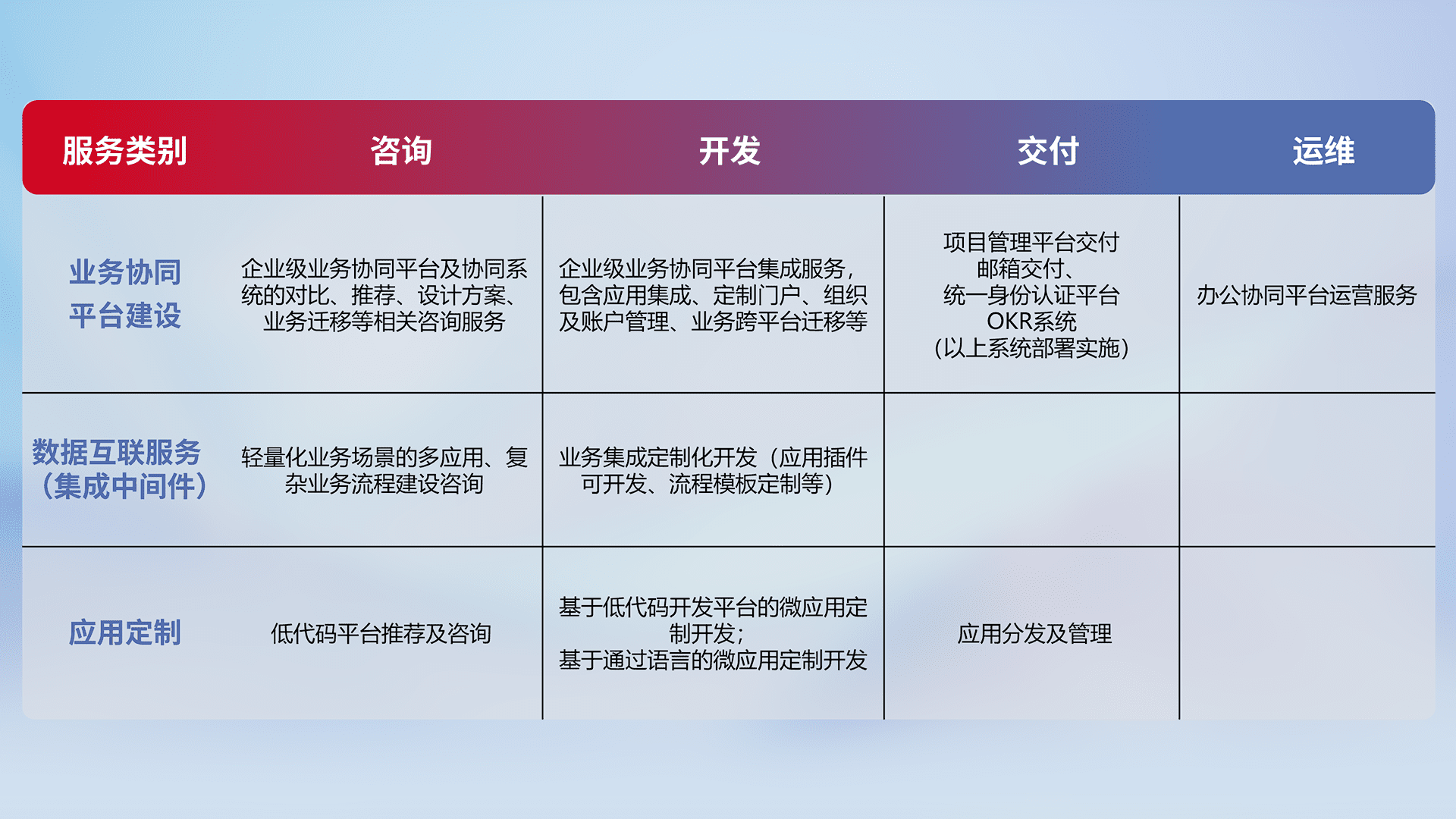 针对钉钉、、、、企微、、、IDaas等平台级产品提供产品的规划、、、、方案、、、交付、、、定制化开发等服务,,实现如统一协同办公、、智能客户服务、、混合会议管理、、智能数据查询、、、、等业务场景,,实现数字化转型。。。