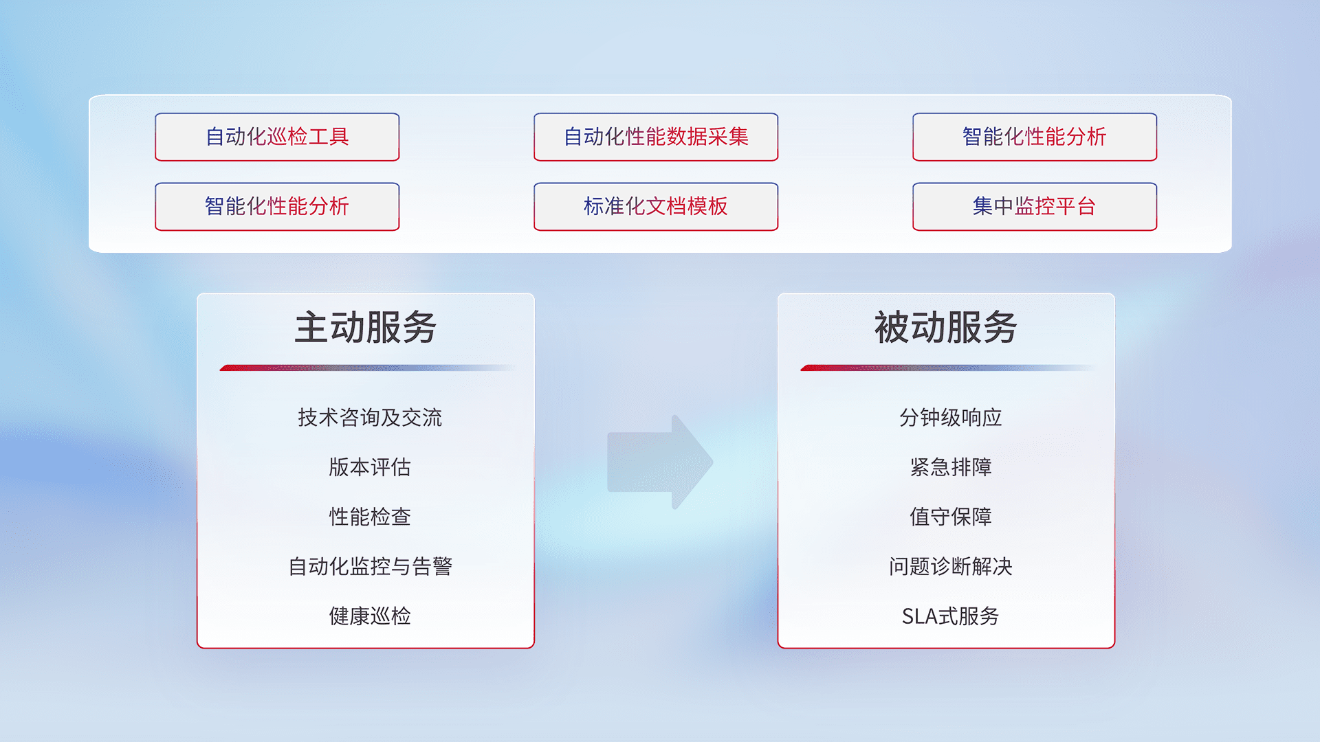 智能化工具和标准化文档,,,,保障服务质量,,,提供主动服务(包含技术咨询、、、、版本评估、、、、性能检查、、、、自动化监控与告警、、健康巡检)和被动服务包含(分钟级响应、、、紧急排障、、、值守保障、、、问题诊断解决、、、SLA服务)。。。