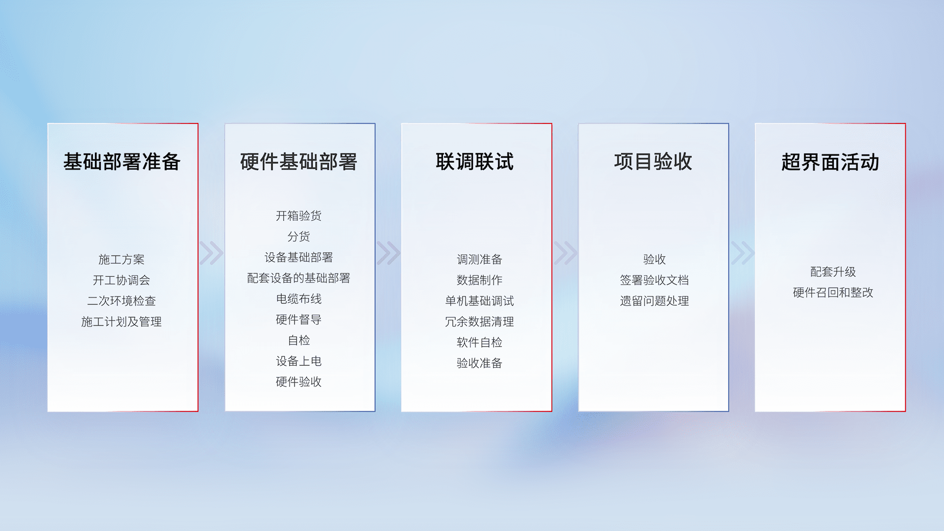 从基础部署准备、、、硬件基础部署、、、联调联试、、、、项目验收、、、、越界面活动的全过程可追溯,,,保证施工质量和进度。。。。